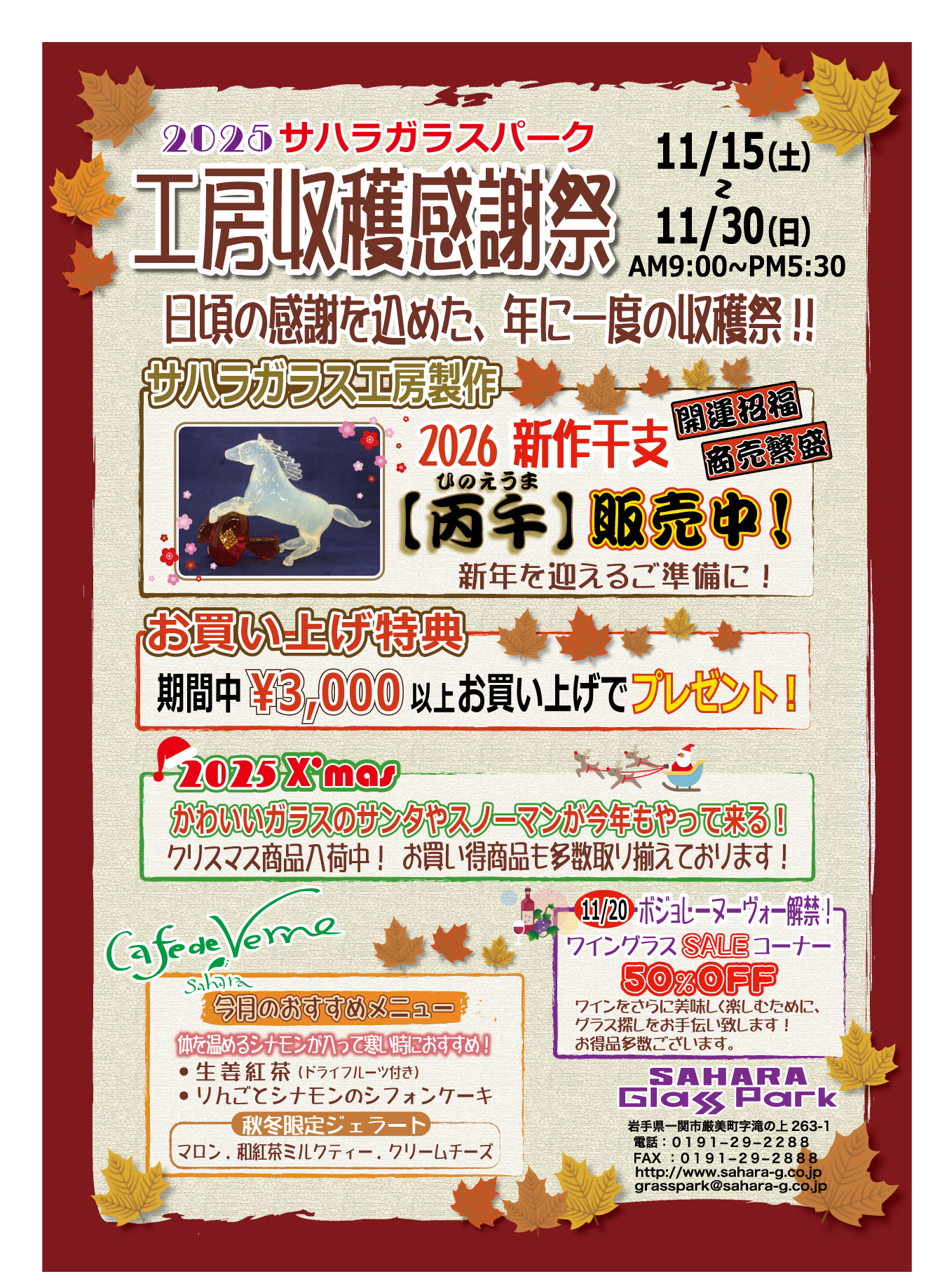| ■2025 11/15〜30 工房収穫感謝祭 ☆ワイングラスSALE50%OFFコーナー開催☆ お買い上げ3,000円以上で素敵なプレゼントあります ※チラシはこちらよりご覧ください←クリック |